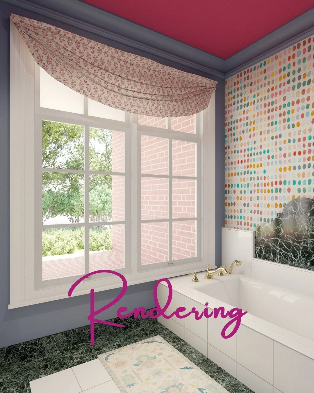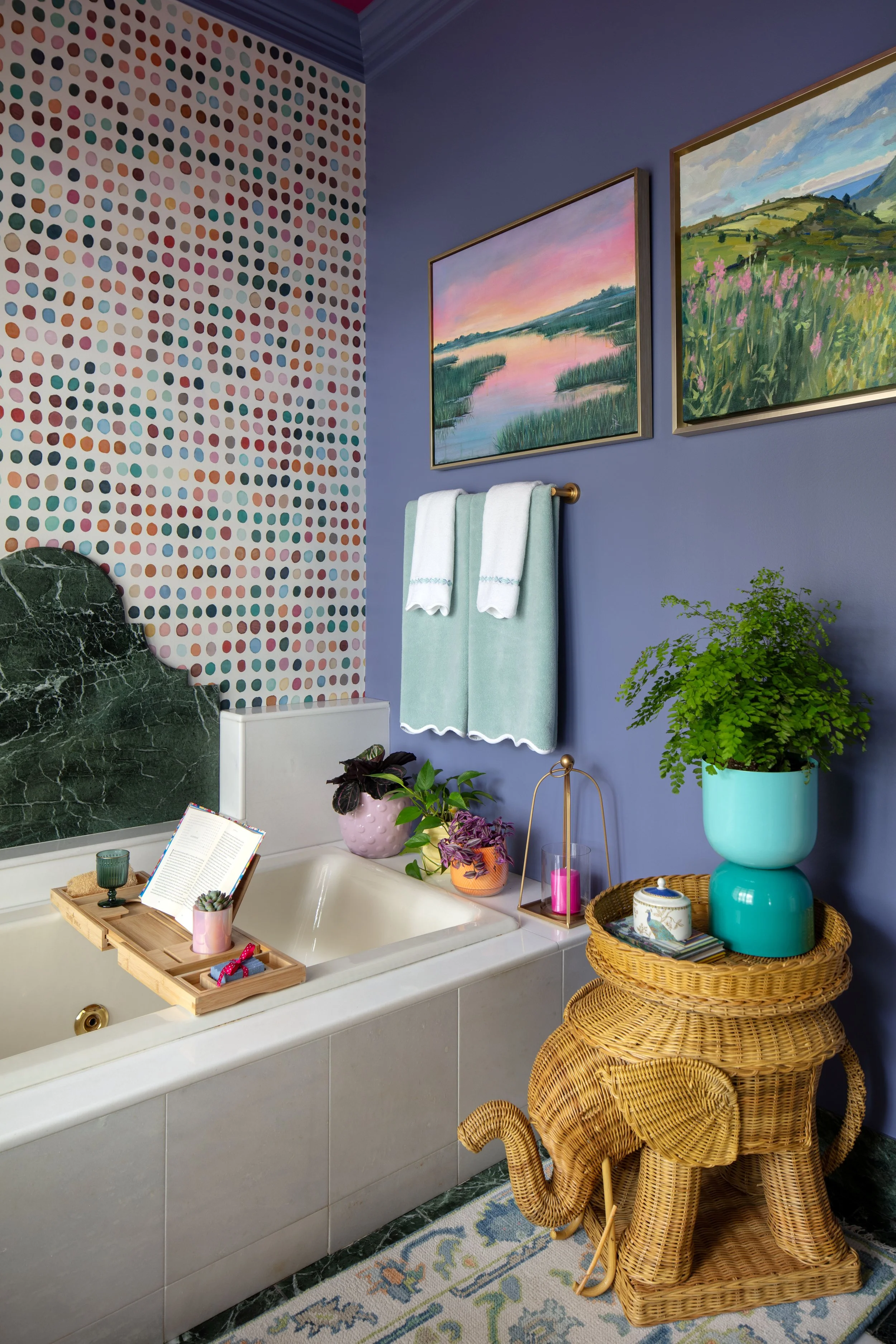 In the bathtub room, a polka-dot watercolor wallpaper continues the color story and adds a playful note. A final, unexpected pop of bold color awaits above - an invitation to look up and discover a delightful surprise.