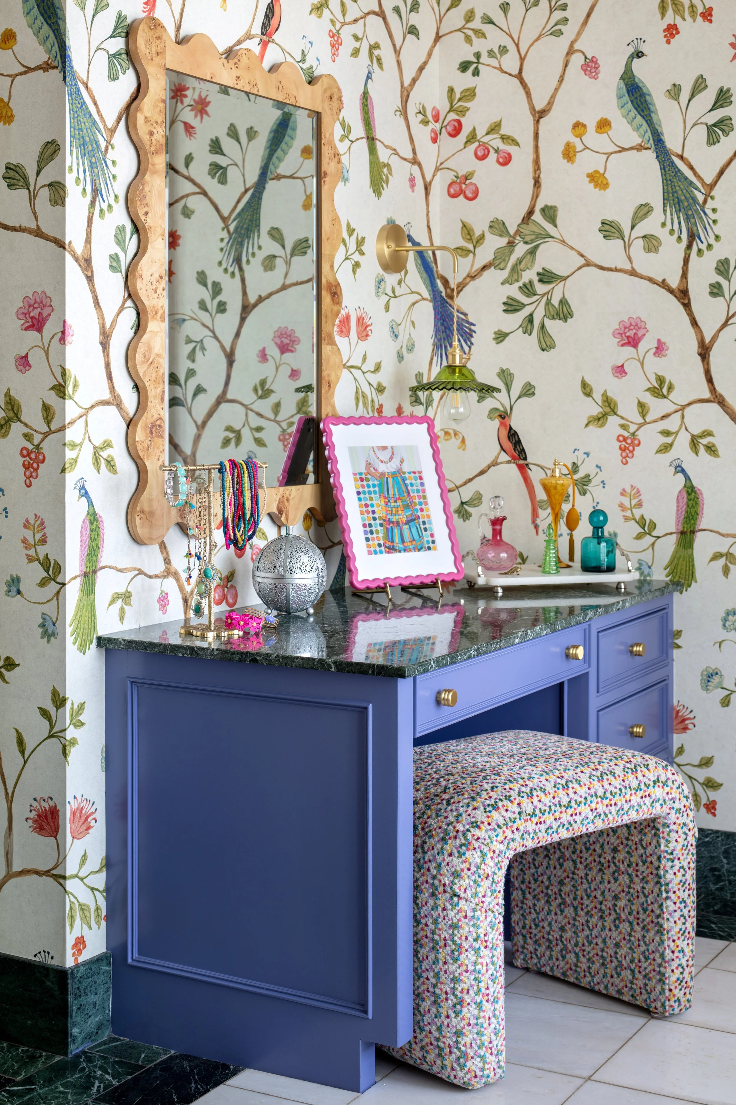 The design began with the Songbirds wallpaper, which establishes the palette, coordinating seamlessly with the existing green tile and introducing a layered mix of complementary hues. The wallpaper honors the style of the home while offering a fresh, updated perspective. Accent colors, patterns, and textures are woven throughout the dressing area to create a lively, distinctive space.