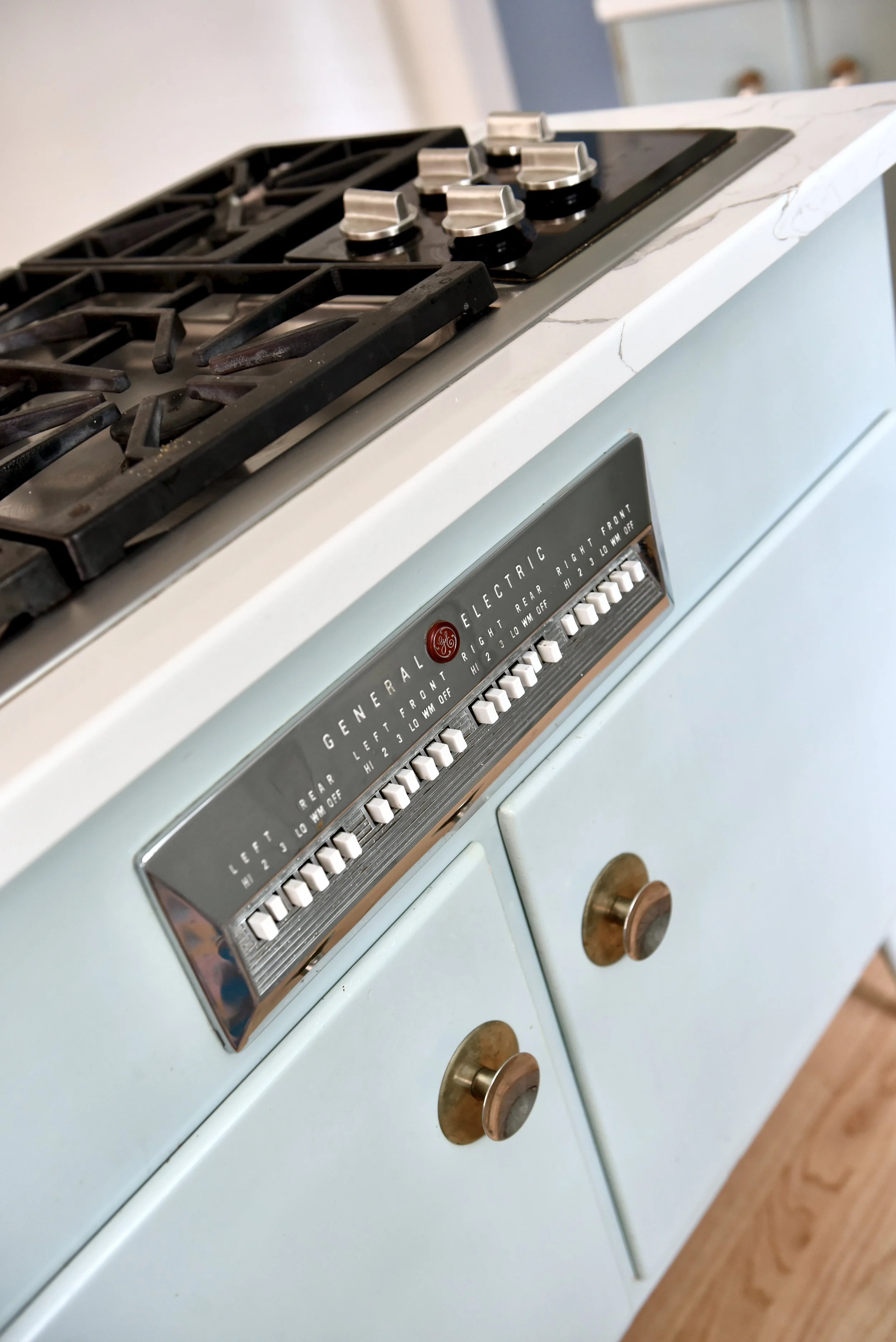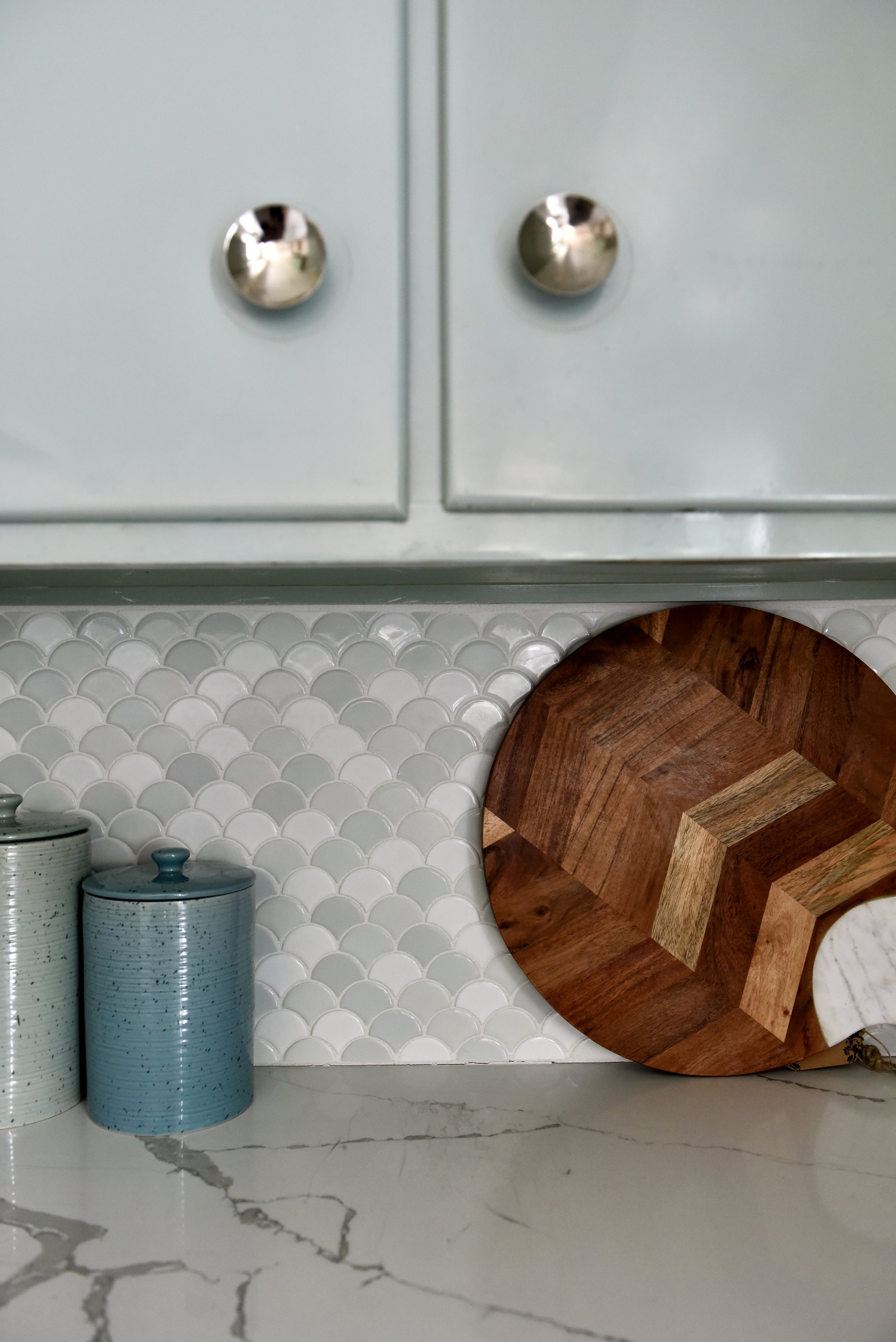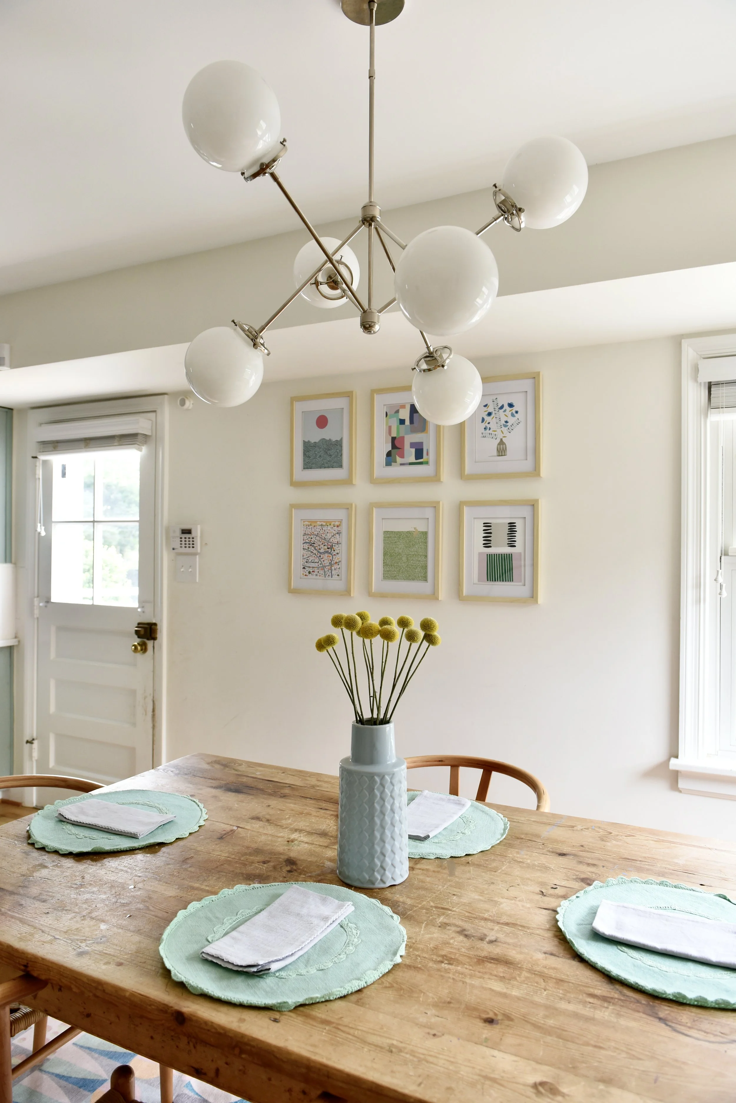 In the living room a traditional rug combined with updated furnishings combine to create a family-friendly living room for a young family. In the kitchen, the original mint green cabinets inspired the design. Updated finishes and fun accents were used to bring color and function to the family’s gathering space.