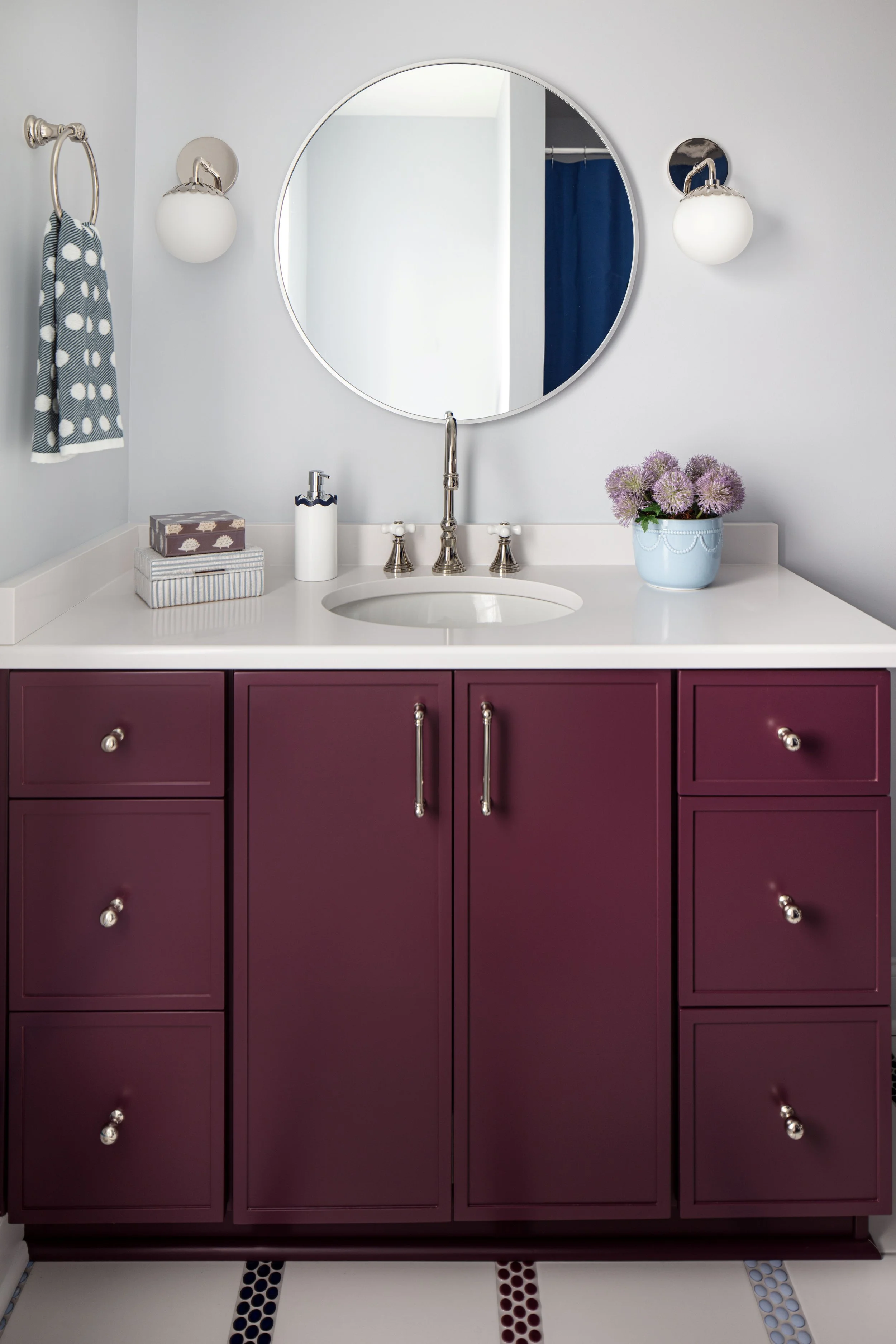 A renovation project in the Hallsley neighborhood of Midlothian, VA. The project included two bathroom renovations and finishing a third floor rec room to create a space for their two daughters to gather with friends. Bold color, quirky artwork, and thoughtful selections create functional spaces for this active family.